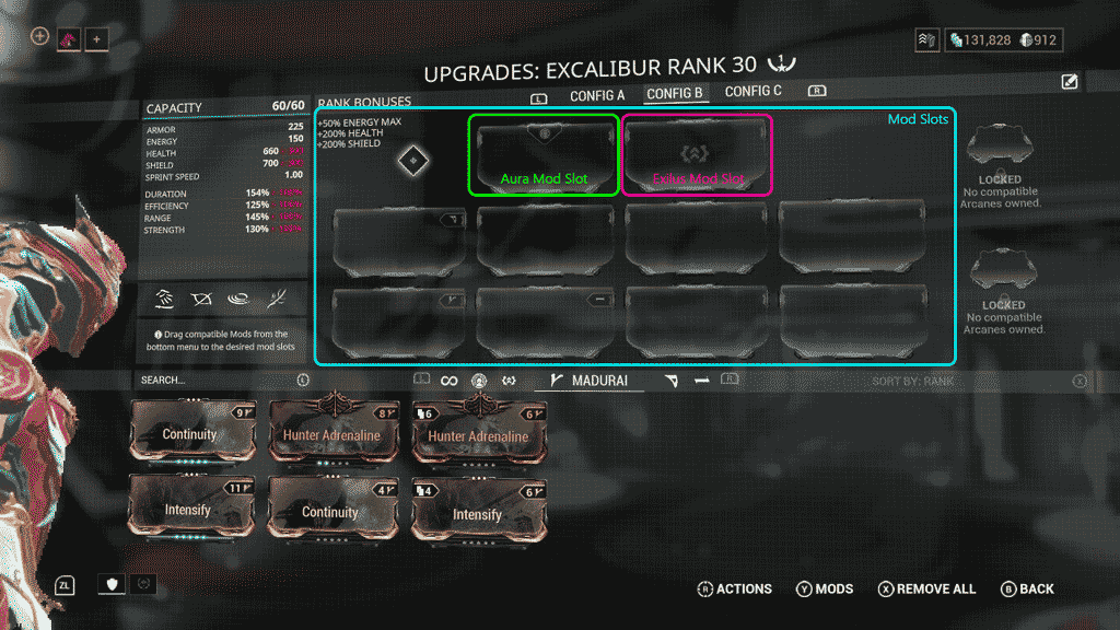 What about the missing slots for aura, exilus, and arcane? This list is designed to . You can buy additional slots from the market kiosk at the top of the ramp in your orbiter. The few weapons i have unlocked exilus slots on, i have put the silencing mods on them. Exilus mods must also be equipped in the special exilus mod slot, which only appears on warframes and not weapons. Below is a list of utility mods that you can use on weapons, taken from the update 26 patch notes. In this warframe sevagoth guide, we show you how to get the parts you. Exilus mods can however be placed in regular mod slots as well. And the unlocked new exilus mod slot for your warframe work like regular mod slot when it . Intensify with augur secrets, and power drift in the exilus slot. Warframe mod slots (blue) with aura (green) and exilus mod slot (pink) marked to use an adapter on pc, click on a warframe's locked exilus slot, . In warframe, players can unlock new warframes and weapons to use in missions. The mod slot will now be unlocked.